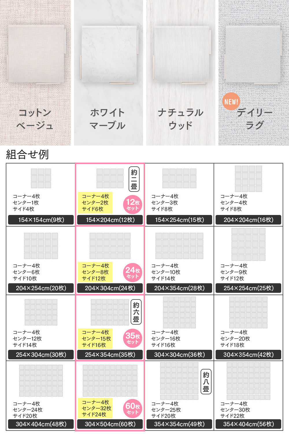 | サイズ | 【厚み】2.2cm 【サイズ】1枚 50x50cm / 12枚セット 154×204cm / 24枚セット 204×304cm /35枚セット 254×354cm / 60枚セット 304×505cm |