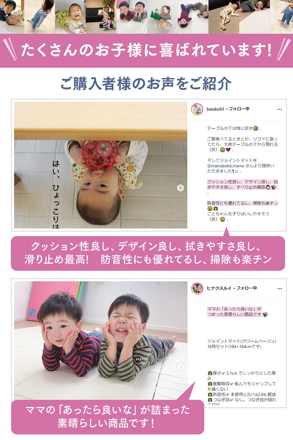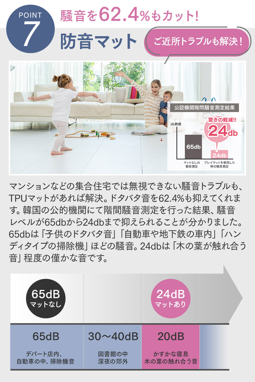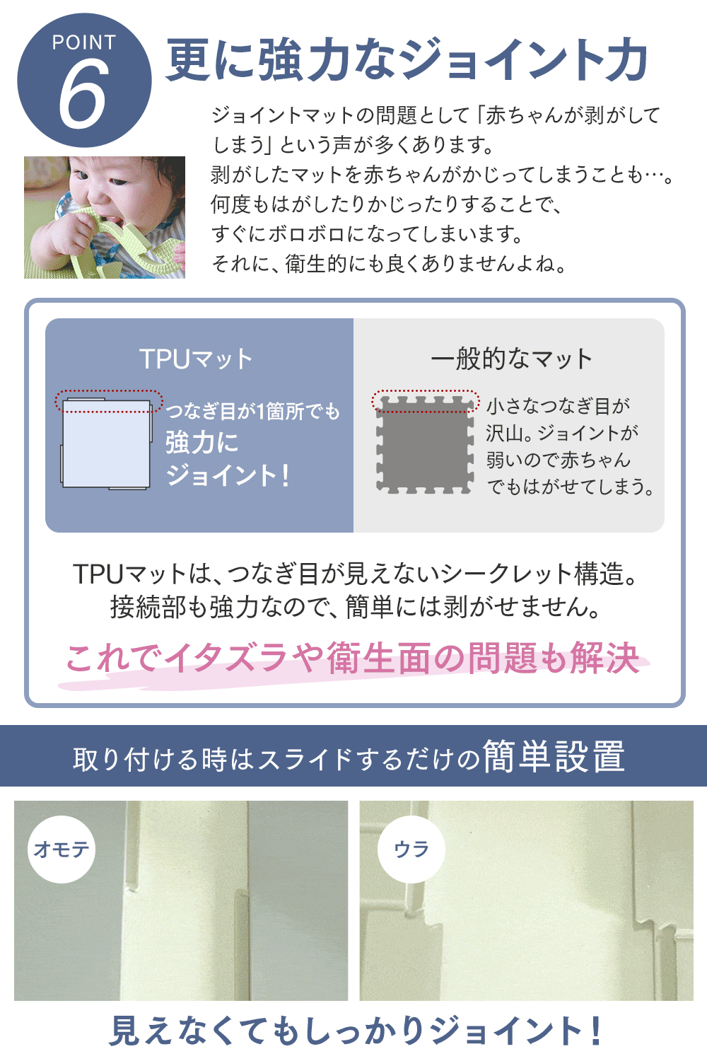 | 商品特徴 | ■商品特徴1 - 旧タイプ(45cm)との共通点 ・厚さ2cm以上の極厚マット ・タイルを敷き詰めたような高級感(一般のジョイントマットのような、パズルのつなぎ目が見えません。) ・衝撃吸収:転んだり頭をぶつけても痛くない。 ・防音性:騒音を62.4%もカット。マンションなどでのご近所トラブル防止 ・剥がれにくい:しっかりジョイント。表面からつなぎ目が見えないので子供が剥がしてかじってしまう心配が無ありません。 ・ノンスリップ加工:滑りにくいので、ズレて裏にゴミや虫が入りにくい ・丈夫さ:5年以上。長く使えるのでコスパ良い。 ・素材:TPU(一般製品はPVCなど劣化しやすい素材) ■商品特徴2 - 新商品(50cm)からの改善点 ・サイズが45-->50cmにアップ ・溝の無いフラットでシンプルなデザイン ・厚みが2-->2.3cmにアップし更に衝撃吸収 ・水受け機能で、液体をこぼしても床に落ちない ・より強力になったジョイント力 ・空気循環ライン |